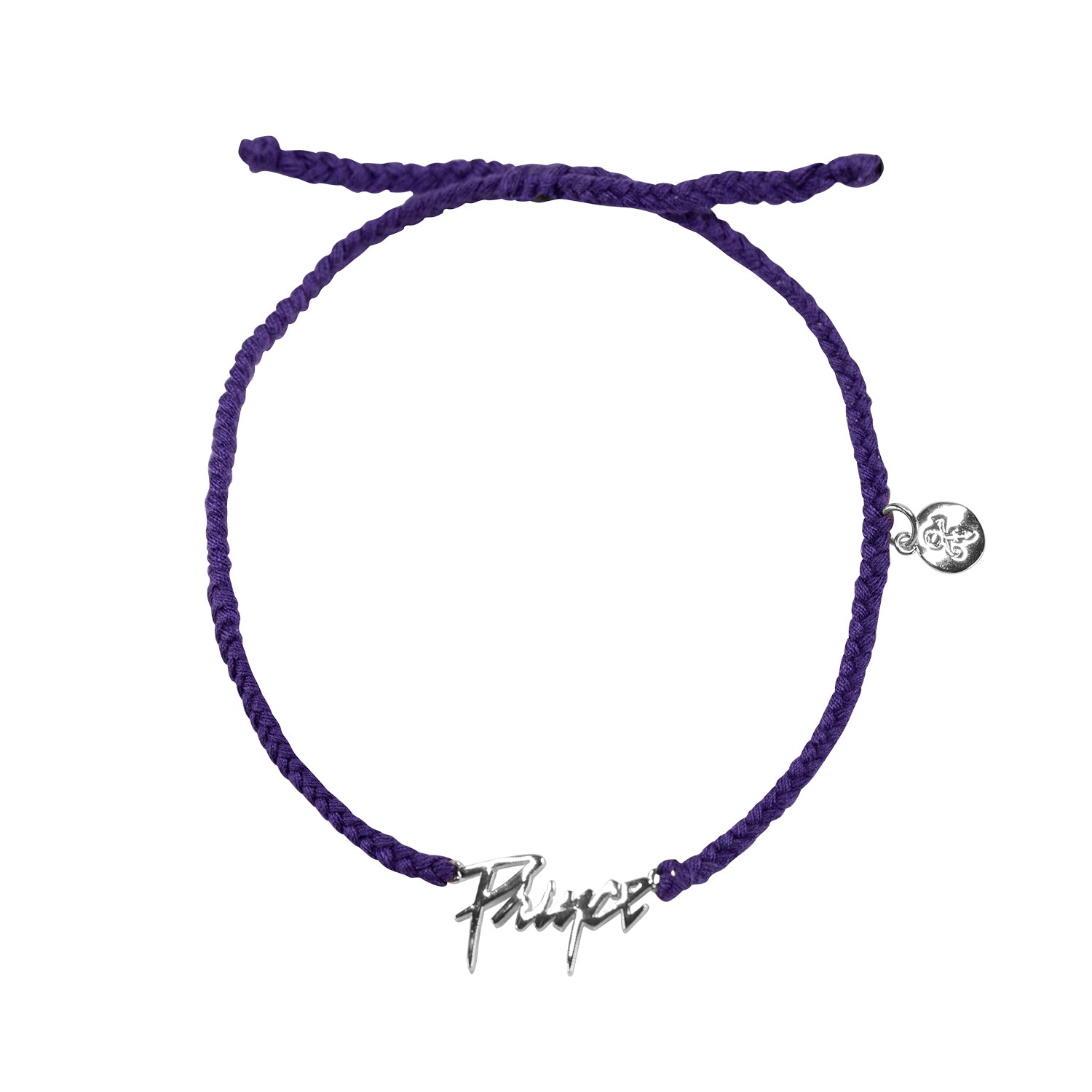 This purple cord bracelet features a 14k white gold Prince Logo charm (0.7" wide) and Prince Symbol tag (0.3" diameter). Length is adjustable from 6"-8" .