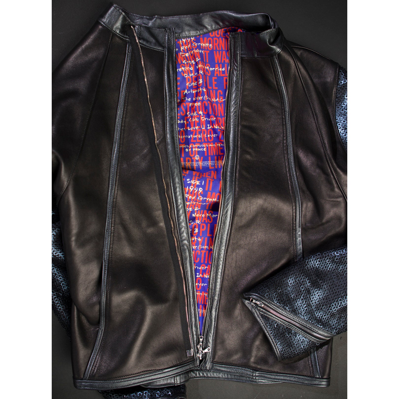 - Back of jacket has "PRINCE 1999" logo laser cut in leather and sewn onto upper back