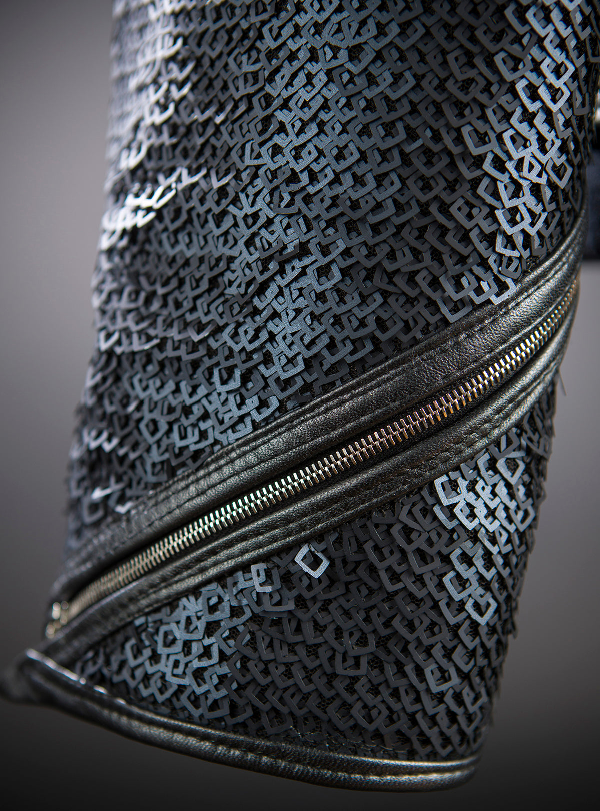 - Leather sleeves are covered in pewter-colored square sequin fabric (feels like chainmail)
