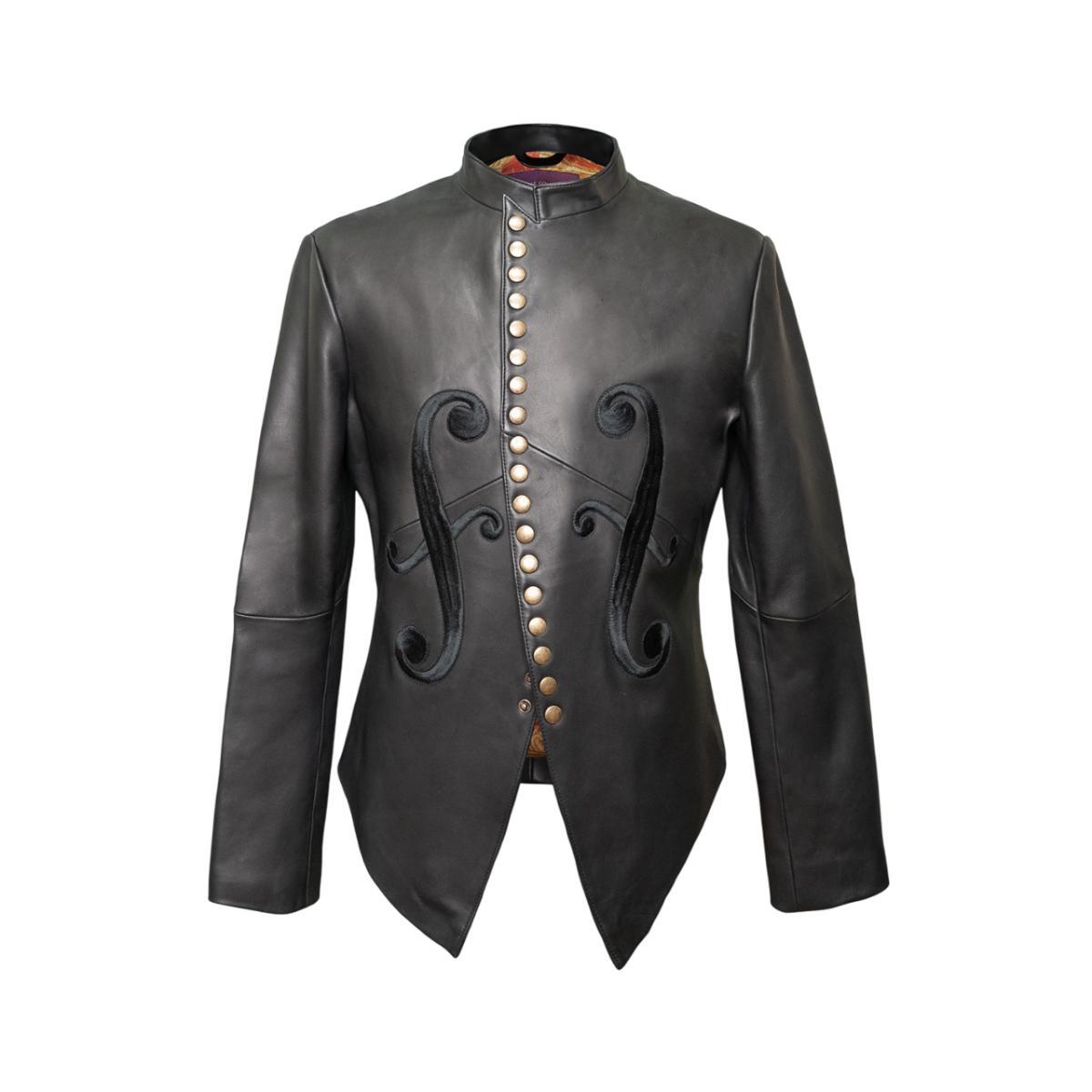 Made of fine leather, the jacket has embroidered F holes (also known as sound holes) on the front, and the earlier Prince symbol on the back giving it a vintage feel.